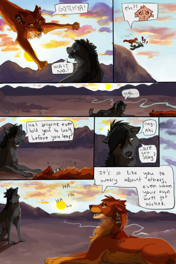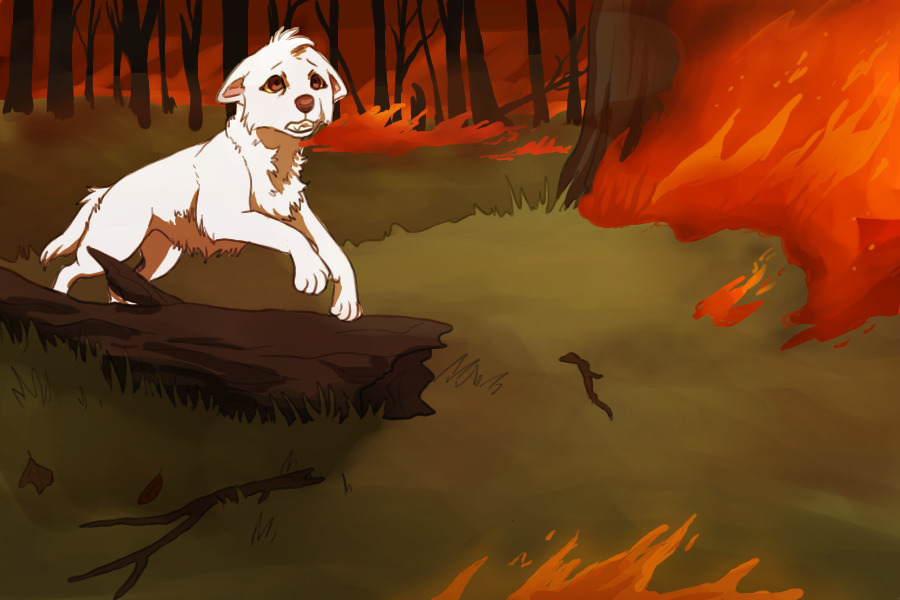 In the valley forest, there existed a pack consisting of twenty or so wolves. All was well, and times were plentiful, until one night, during a new moon, an elder received a prophecy telling him that darkness would become the pack's downfall. The pack was put into chaos as everyone became suspicious about what the foreboding prophecy meant. Two pups were born days later to a lower ranking wolf. One pup, Ira, was pure white, but the other, Fero, was born nearly black. The pack took the pup's fur as a sign that he would grow to be the pack's greatest enemy. Days after they were born, Ira and Fero were banished from the pack forever, along with their parents, doomed to live in exile. Tragically, Fero and Ira's mother was caught hunting in an enemy pack's territory, and was killed. Not long after the pups' father fell ill and died as well of an unknown disease, leaving the two young brothers to fend for themselves. They managed to scrape by, but a few months after the death of the pups' father, a lightning strike set the forest ablaze, and leaving the hapless brothers to face the raging inferno alone. Note; After messing around with oekaki for a little while, I decided that it would be very difficult to bring out the full potential of the comic with what oekaki has to offer, so I decided on a middle ground; I'll paint a scene in oekaki, and the panels will be underneath? Let me know if this is a problem for anyone ovo ALSO it did not take me 25 hours to do this omg I just left the window open oops |