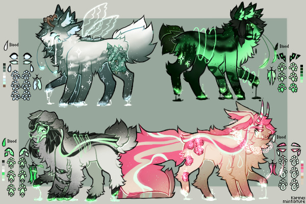 *rolls them onto the table like dice* kit 1 (top left) - woodland fairy [NR] weight (thin), sclera, blood colour [S] hair, shine (left side only), teeth [C] tail, fur, backmane [U] ears, pupils, tongue [R] extra eyes, halo (wings), extra limbs (2), multiple tails (2), reverse munchkinism, horns, extra ears (1 set), goop (mouth, eyes, paw pads), shaped paw pads, polydactyly (6), double iris, small paws, body shine, shaped eyes, double tongue, whiskers, glow (eyes, paw pads, whiskers) kit 2 (top right) - moonlight cryptid [NR] weight (thin), sclera, blood colour [S] hair, shine (right side only), teeth [C] tail, fur, backmane [U] ears, pupils, tongue [R] extra eyes, halo (slinky), extra limbs (2), multiple tails (2), reverse munchkinism, horns, extra ears (1 set), goop (mouth, eyes, paw pads), shaped paw pads, polydactyly (6), double iris, small paws, body shine (stars), shaped eyes, double tongue, whiskers, glow (eyes, paw pads, whiskers) kit 3 (bottom left) - radioactive demon [NR] sclera, blood colour [S] hair, shine (snake, left side only), teeth [C] tail, fur, backmane [U] ears, pupils, tongue [R] extra eyes, halo (skull + ribs), extra limbs (2), multiple tails (2), reverse munchkinism, horns, extra ears (1 set), goop (mouth, paw pads), shaped paw pads, polydactyly (6), double iris, small paws, body shine, shaped eyes, double tongue, whiskers, glow (eyes, paw pads, whiskers) kit 4 (bottom right) - rose devil [NR] sclera, blood colour [S] hair, shine (roses, right side only), teeth [C] tail, fur, backmane [U] ears, pupils, tongue [R] extra eyes, halo (roses), extra limbs (2), multiple tails (2), reverse munchkinism, horns, extra ears (1 set), goop (mouth, eyes, paw pads), shaped paw pads, polydactyly (6), double iris, small paws, body shine, shaped eyes, double tongue, whiskers, glow (eyes, paw pads, whiskers) |