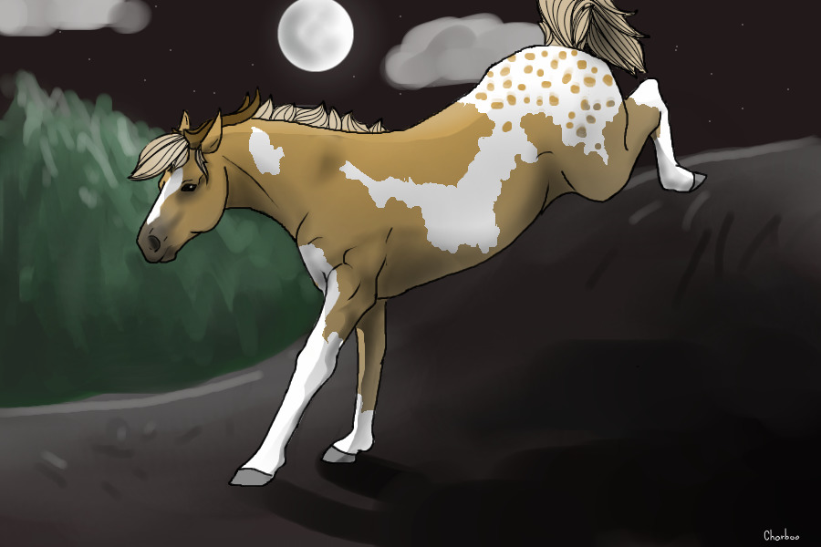 History: Mink, as you know, lived in a woodland by a seashore in a fairly small herd. In her herd, it was simply a small family. Her dad was the leader and her mother was one of the two females. Then her and her brother. There was to be a sixth soon. Life was ruff there though. Since they lived in a small woodland by the sea, finding good, green grass was difficult. Getting to the point, Mink goes off and finds grass at dawn for her herd. Not think there was any real danger anyway. Once or twice, she would catch the sent of bear or cat. Not going into danger, she goes back and they will just eat dried up sea grass, and maybe a few thistles. (My horses eat them). One morning, she went off to find that one spot that she found the other day. Walking over roots and zigzagging through trees, she heads off by memory. She knows she is getting close when she sees a opening. Walking past the tree line, she gets a strong whiff of cat. Petrified, she sniffs the air trying to find the direction of the sent. Not liking where the sent was coming from, she turns around to find a cougar a few yards away in the tree line. It's sniffing the ground, following her tracks. By instinct, Mink turns and runs, runs as fast as she can. She knows the cat is right behind her, she keeps running, non stop. Finally the cougar stops, not wanting to go any further. She now knows why. A strange smell looms in the air. A smell she doesn't know. Wanting to know why, she walks slowly to the source, finding a strange object in the middle of the field. Treading closer, she hears a little "poof" and feels a sting on her hock. Looking towards the sound, every thing goes blurry and faint. The next thing she knows, she is in a area with a barrier around it. She sees strange creatures, walking and standing on two legs. Confused, she hears them making weird noises.