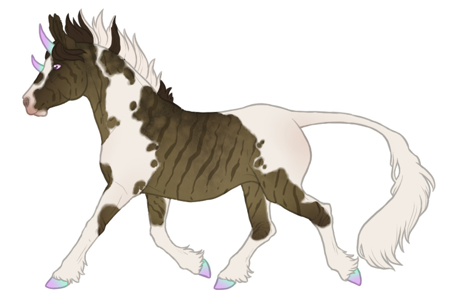 Due to their fey ancestry, it is not uncommon to see all sorts of fantastical colors accenting otherwise average equine coat colors. Often times these vibrant colors will appear as small ascents such as hoof coloration, or tinting marking that are normally white, but on rare occasions the bicorns base coat will be affected by the unique coloration.