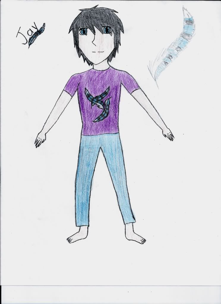 Description: He has black hair that falls into his eyes, blind blue eyes, scrawny but tall, and pale.Clothes: Jay usually wears a T-shirt and blue jeans or jean shorts. He never wears shoes. His shirts often have blue jay feathers depicted on them.