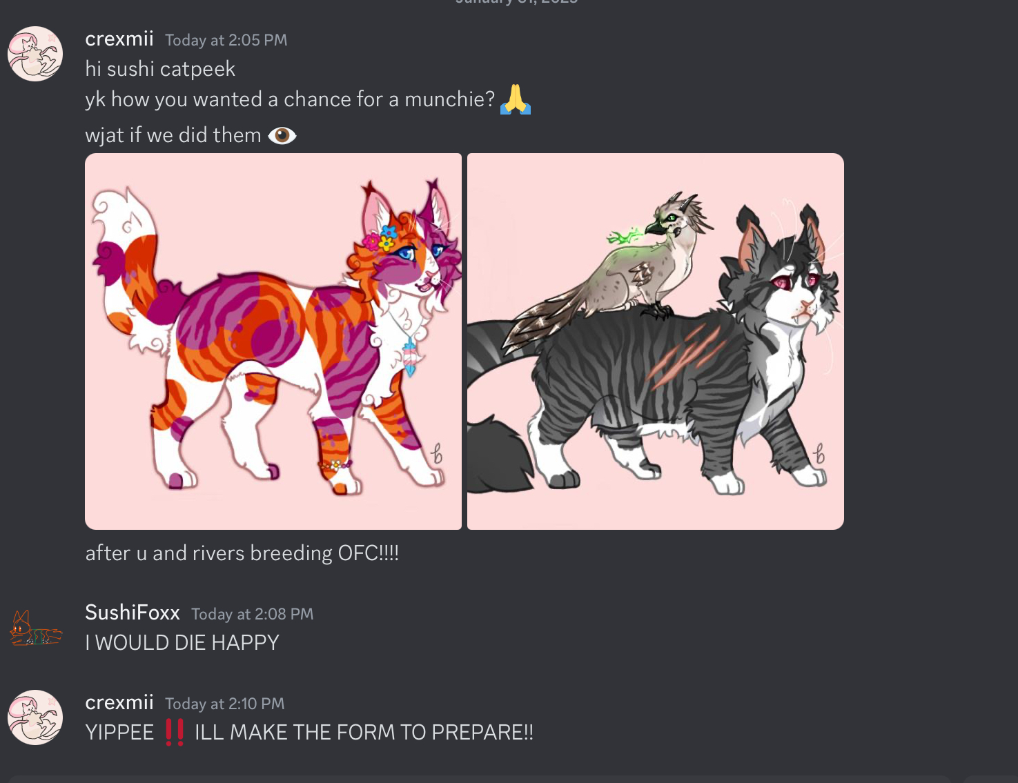 Hypothetical kits from these two would likely spend most of their early years around their mother Farra, while Darian visits occasionally. As they get older, they would likely want to become hunters like both of their parents, but it's possible one might want to become a healer if they saw a parent come home with battle wounds. The potential healer kit would probably go to study under