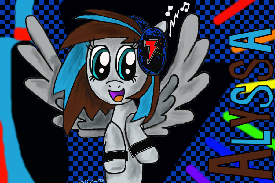 This is me as a My Little Pony. My name would be Alyssa Shynote. I designed this just for fun. Please do not copy how i look or my cutie mark, (shown on the headphones and in the background), but I would like to see how you would design yourself as a pony and what you think your cutie mark would be. If you did, I would love to see it.