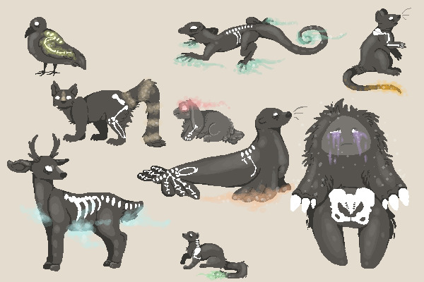 Things that died, decomposed, and came back as shadows-things, along with a section of their bones. They have a colored 'spirit' that tags along with them on different parts of their body.
