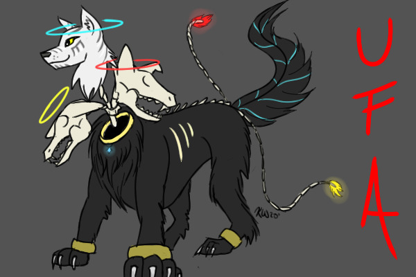 The blue-halo'd head is meant to represent life and goodness throughout the universe, the red-halo'd one represents the anger, chaos, and general unpredictability of things, and the yellow-halo'd one represents the insecurities and fears of the universe. I decided to make the two negative-traited heads skeleton heads in a way to symbolize how both of those emotions tie into the theme of death! Also, this boy(s?) is meant to be standing in like a more of a 3/4 portrait style, so he's longer than he seems; I hope I conveyed that well enough!!