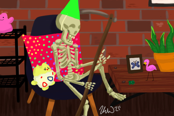 Loosely based on an area of my apartment lol! I have the skeleton (Halloween decoration =P), Togepi, chair, pillow, teeny tiny frog and Ditto plush!♥ It'd be so cool to have a tiny yard flamingo, I wonder if they make those!