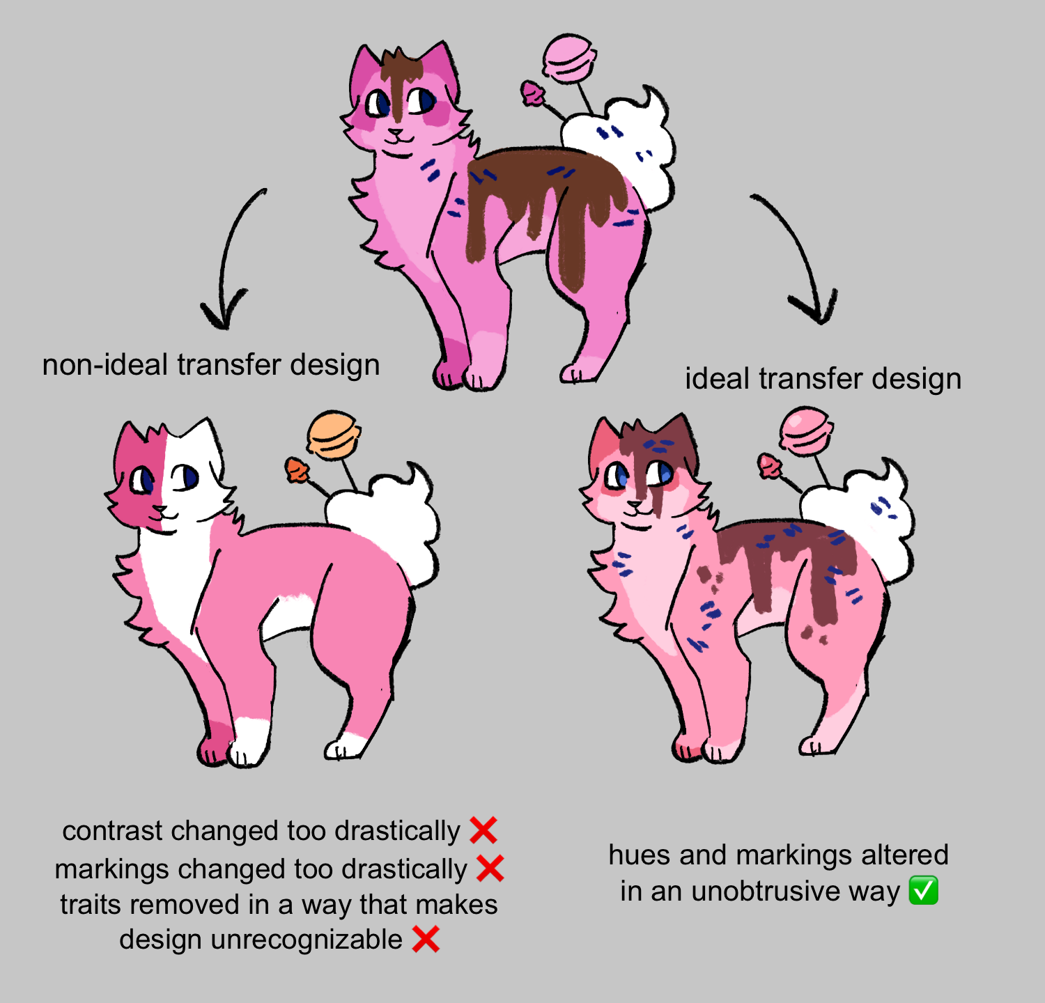 - A transfer should not majorly alter the character’s original design, though small tweaks are allowed to a degree (here is a visual example).