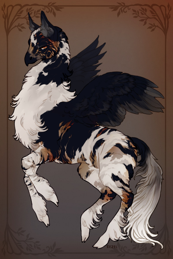 hippogriff on the mind. this is betula! I based her design around birchwood, melanistic zebras, and dutch shepherds.